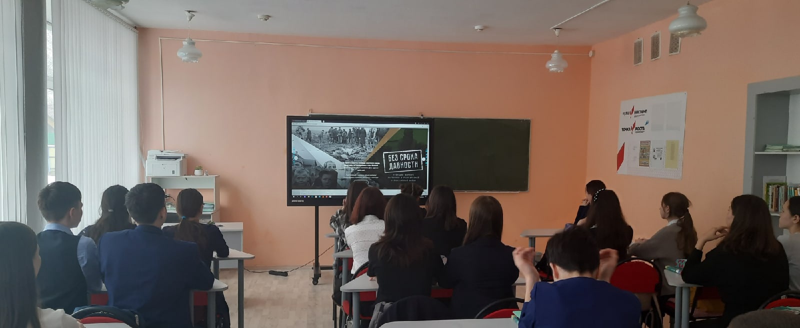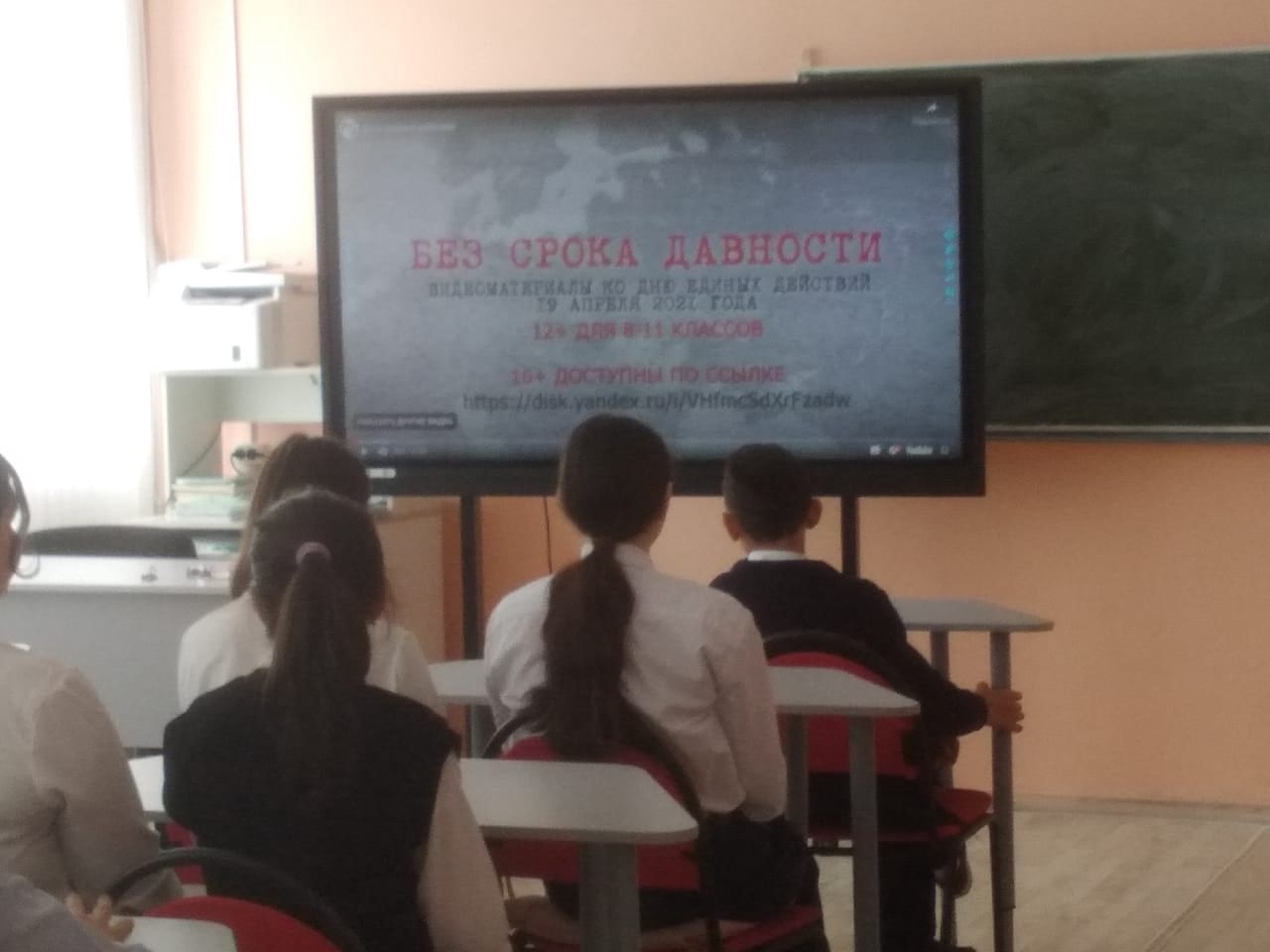 19 апреля проходит Всероссийская акция "День единых действий" в память о геноциде советского народа. В этот день в 1943 году был издан Указ Президиума Верховного Совета СССР N39 "О мерах наказания для немецко-фашистских злодеев, виновных в убийствах и истязаниях советского гражданского населения и пленных красноармейцев, для шпионов, изменников родины из числа советских граждан и для их пособников". Обучающиеся 6б, 7а, 7б и 8а участвовали на уроке-просмотре исторических фактов "Без срока давности".