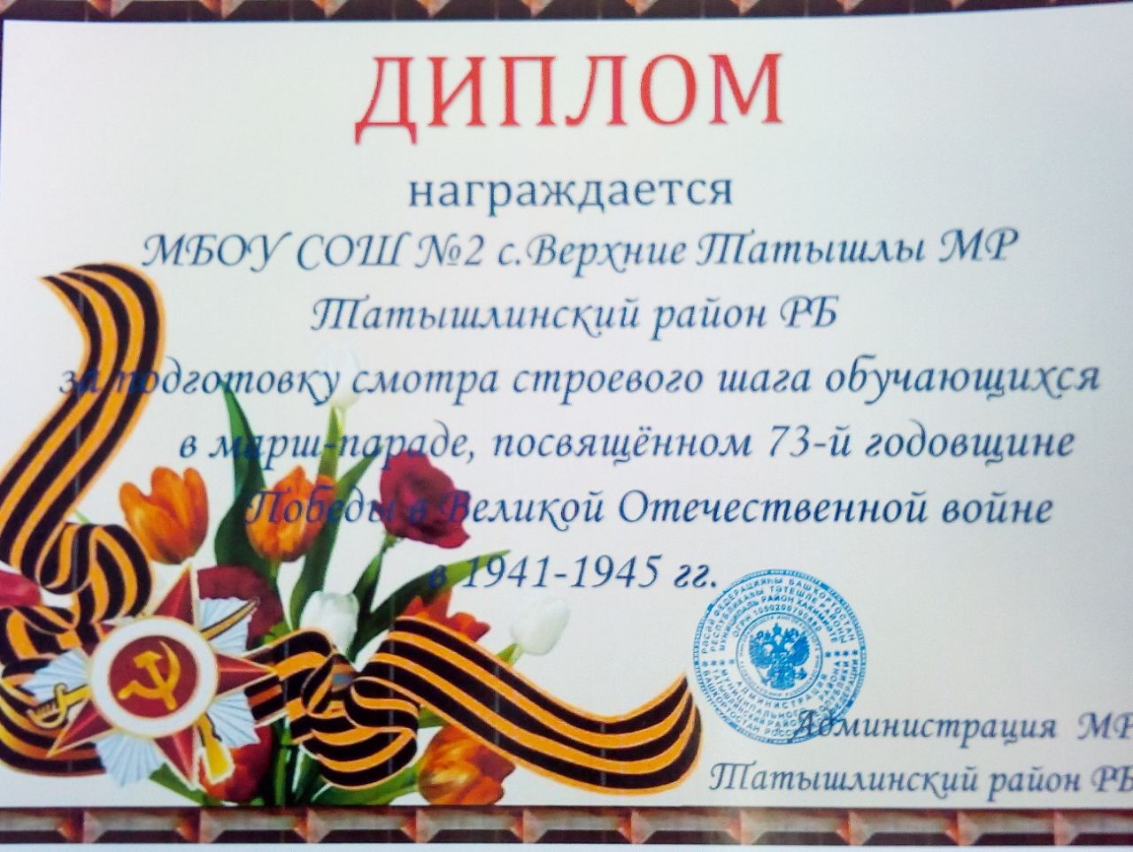 Мы встретили 73-ю весну Великой Победы. Обучающиеся МБОУ СОШ №2 села Верхние Татышлы, приняли участие в ежегодно проходящем смотре строевого шага и строевой песни. Все обучающиеся отнеслись к главному мероприятию праздника очень ответственно. А обучающиеся 1-2 классов, которые представили взвод медсестер, особо украсил праздник. С каким старанием маршировали они вслед за старшими. Безусловно, все это оставило незабываемые воспоминания. По окончания парада школа была награждена Дипломом администрации МР Татышлинский район РБ за подготовку смотра строевого шага в марш - параде, посвященном 73-й годовщине Победы в Великой Отечественной войне 1941-45 гг. А 14 мая нас пришли поблагодарить представители администрации района Исламова Р.К и Валиева Э.Д. и преподнесли гостинцы каждому взводу.