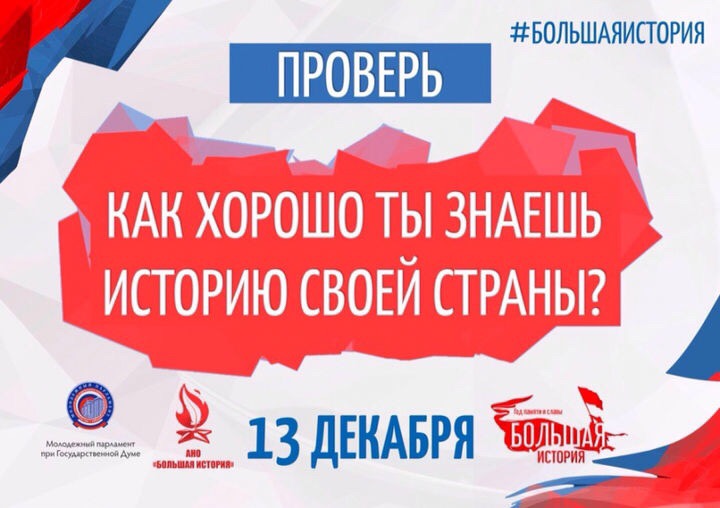 Ежегодная образовательная акция «Тест по истории Отечества» проводится при содействии Молодёжного парламента Государственной Думы в рамках федерального проекта «Большая история» Эта акция проводится широкомасштабно. Россияне, иностранцы и соотечественники из 42 стран могут проверить свою историческую грамотность.