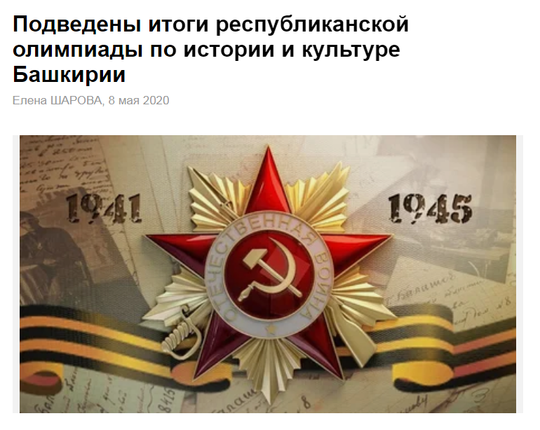 Со 2 марта по 10 апреля 2020 года в дистанционной форме была проведена Республиканская олимпиада по истории и культуре Башкортостана, посвященная участию башкортостанцев в Великой Отечественной войне 1941- 1945 годов. В Республиканской олимпиаде приняли участие 256 обучающихся 7-11 классов общеобразовательных организаций из 55 муниципальных районов и городских округов Республики Башкортостан и 33 обучающихся профессиональных образовательных организаций. Участниками Республиканской олимпиады было представлено 286 проектных работ по 8 направлениям: «Башкирская АССР в годы Великой Отечественной войны», «Наши земляки – участники Великой Отечественной войны», «112-я Башкирская кавалерийская дивизия», «Труженики тыла и дети войны нашего края», «Память о Великой Отечественной войне в моей малой Родине», «Тема Великой Отечественной войны в литературе и фольклоре народов Башкортостана», «Моя семья в годы Великой Отечественной войны», «Семейная шкатулка военных реликвий». Обучающаяся 7а класса нашей школы Ахунова Альбина Данировна стала призером в направление: «Наши земляки - участники Великой Отечественной войны» (на башкирском языке), руководитель Муллаярова Э.Р. Молодцы, так держать!