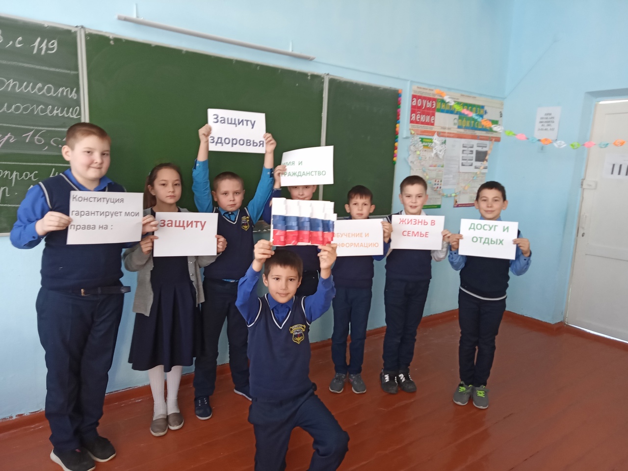 На уроке дети узнали о том, что такое Конституция, когда она была принята, что провозглашает. Особое внимание уделено рассмотрению прав и обязанностей граждан РФ, понятию гражданство. Ребята рассказывали о символах государства, участвовали в творческих заданиях.