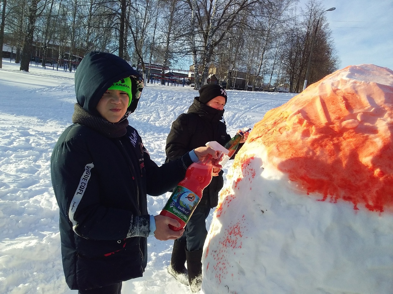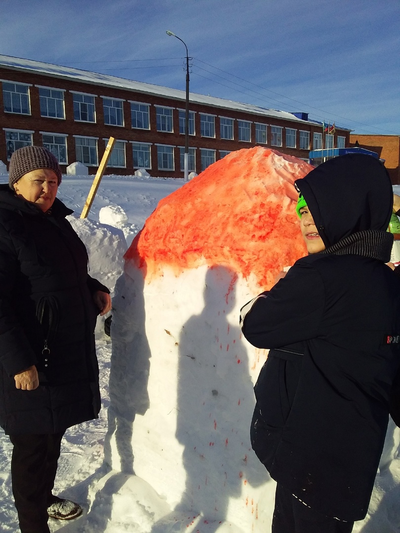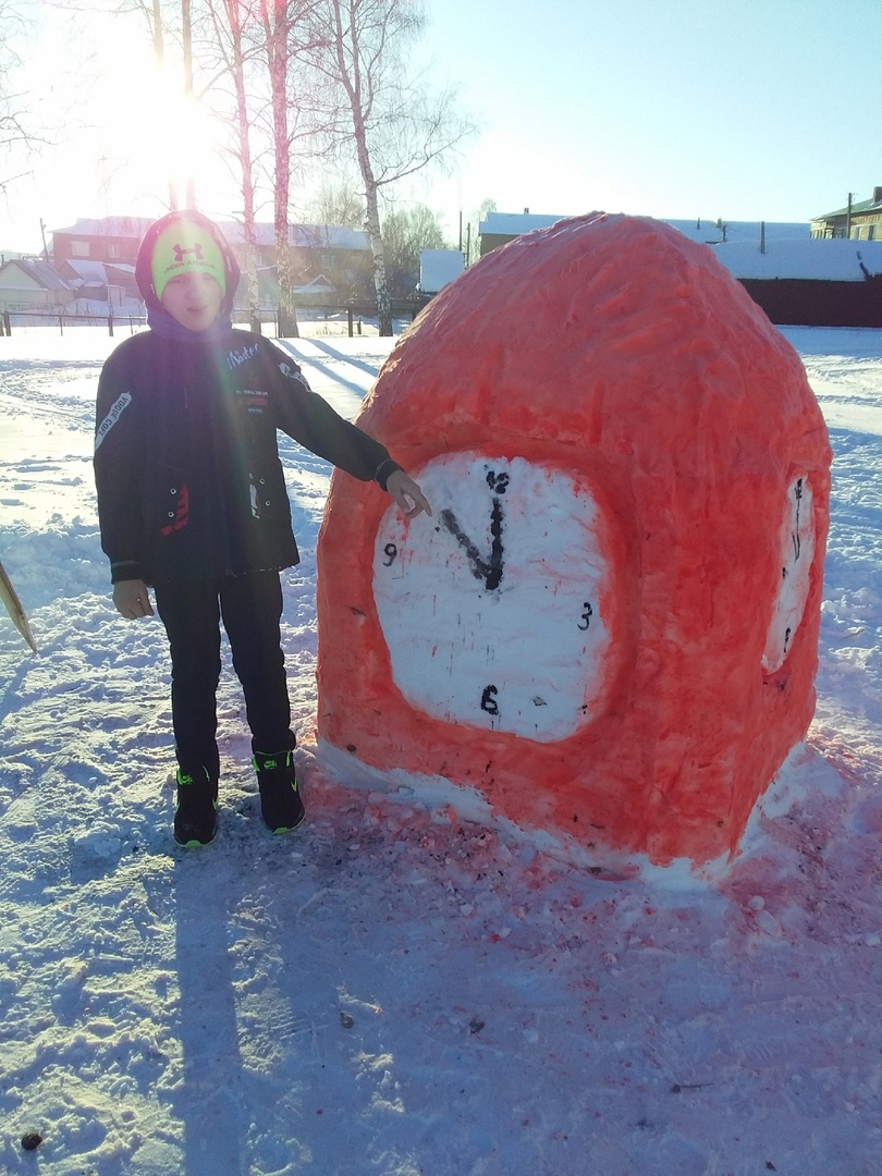 В школьные годы проходит немало конкурсов, среди которых есть также конкурс снежных фигур. 6 а класс слепили огромные часы. Фигуры из снега смотрятся куда эффектнее, если они раскрашены в разные цвета. Все ребята 6 а класса работали дружно, с интересом. Альмир тоже работал с удовольствием.