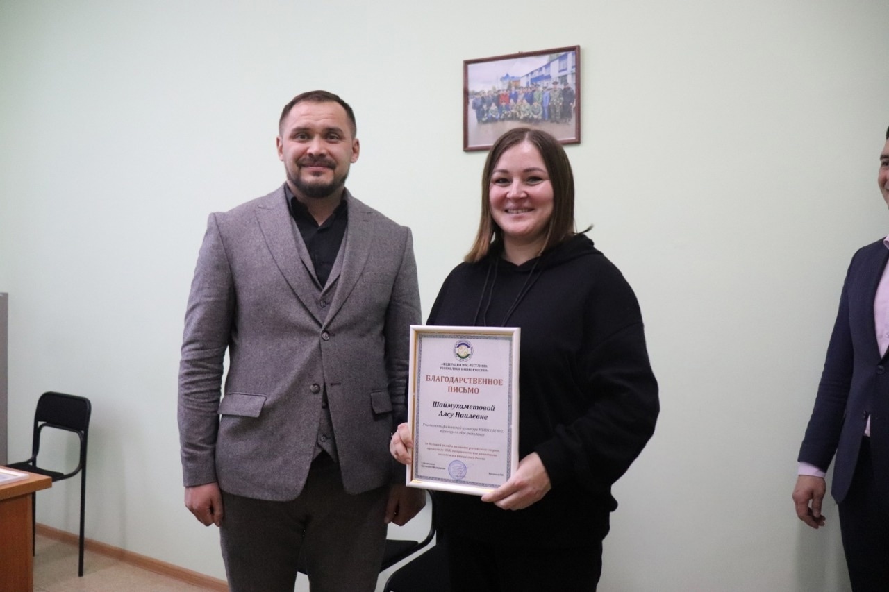 учителя физической культуры МБОУ СОШ 2 с. Верхние Татышлы, тренера по мас-рестлингу Шаймухаметову Алсу Наиловну, за большой вклад в развитие российского спорта, пропаганду ЗОЖ, патриотическое воспитание молодёжи и юношества России.