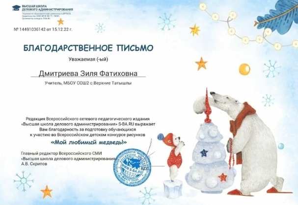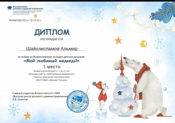 Ученик 6 а класса Шайхлисламов Альмир очень любит рисовать и участвует в различных конкурсах. В этот раз он участвовал на "Всероссийском конкурсе детских рисунков "Мой любимый медведь!" и занял почётное первое место. Альмир, поздравляем тебя с этой победой и желаем дальнейших успехов!