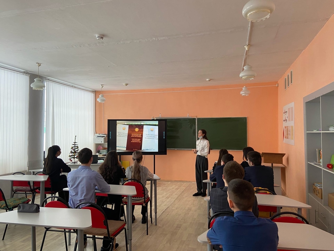 23 декабря, в преддверии Дня Конституции Республики Башкортостан, во всех классах проведены классные часы, посвящённые этому событию. Советник директора по воспитанию Хисамова Л.А. ознакомила ребят 9 класса с основными постулатами Конституции, рассказала о государственных символиках: гербе, гимне, флаге Республики Башкортостан, ребята вспомнили об основных правах и обязанностях граждан РБ.