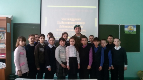 В рамках реализации Всероссийской общественно – государственной инициативы «Горячее сердце» 17 февраля 2017 года в 5б классе прошёл Урок мужества, на который был приглашён представитель общественной организации пограничников «Пограничное братство» Роберт Ситдиков. Урок начался с Минуты молчания воинам, павшим смертью храбрых на полях сражений. На встрече с учащимися воин-пограничник рассказал школьникам об истории участия пограничных войск в ходе Великой Отечественной войны, о трудностях и особенностях службы на границе. Ребята получили много интересной информации. В годы Великой Отечественной войны на пограничные войска была возложена обязанность по охране тыла действующей армии. Пограничные полки обороняли Одессу, Сталинград, Севастополь, Ленинград, Москву, участвовали в разгроме фашизма на территории Европы. По рассказу гостя ребята узнали, что 150 пограничников удостоены звания Героя Советского Союза. Встреча получилась насыщенной и интересной. В тишине слушали ребята выступление Роберта Ахнавиевича, который очень интересно рассказывал о времени своей службы. После выступления ветерана ребята задавали интересующие им вопросы, на которые получали наглядные и подробные ответы. В конце встречи все пришли к единому мнению – такие встречи необходимы подрастающему поколению. Они учат сопереживать героям, воспитывают мужество. Встреча была незабываемой. Школьники приняли наказ гостя вести здоровый образ жизни, заниматься спортом, добросовестно учиться и быть готовыми к защите Отечества. Ребята были благодарны за интересное и полезное мероприятие и пожелали всем воинам-пограничникам крепкого здоровья, счастья, благополучия, успехов в достижении поставленных целей, добра и удачи.