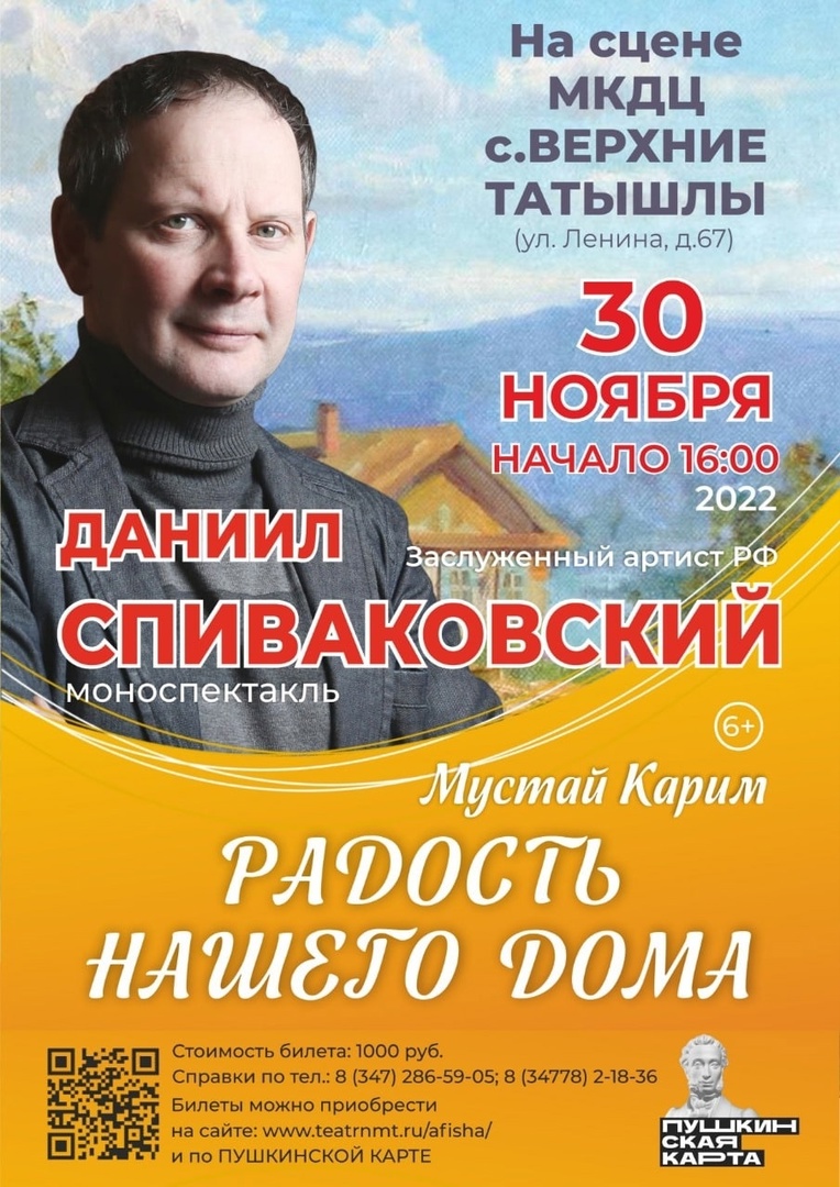 30 ноября на сцене районного Дворца культуры харизматичный актер театра и кино, заслуженный артист РФ Даниил Спиваковский представил моноспектакль «Радость нашего дома» по произведению народного поэта Башкортостана Мустая Карима. В спектакле прозвучали отрывки из повести, которые были собраны артистом в авторскую инсценировку. Весь спектакль сопровождался жестами, эмоциями, игрой артиста, музыкальными вставками. Даниил Спиваковский покорил зрителей своим ярким выступлением.