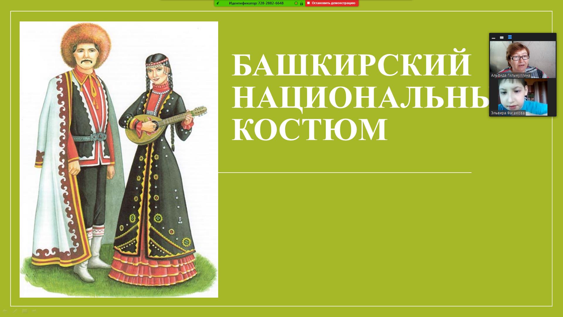 Мы тоже присоединились к данному мероприятию. На уроке родного языка посмотрели видеопрезентацию про башкирский костюм, изучили и запомнили названия элементов одежды. Вспомнили виды орнаментов, характерных для национального костюма. Узнали много нового о национальных костюмах, об их самобытности и неповторимости и о том, где можно встретить национальную одежду в наши дни. Радмир принимал активное участие на уроке и с удовольствием нарисовал национальную одежду своего народа.